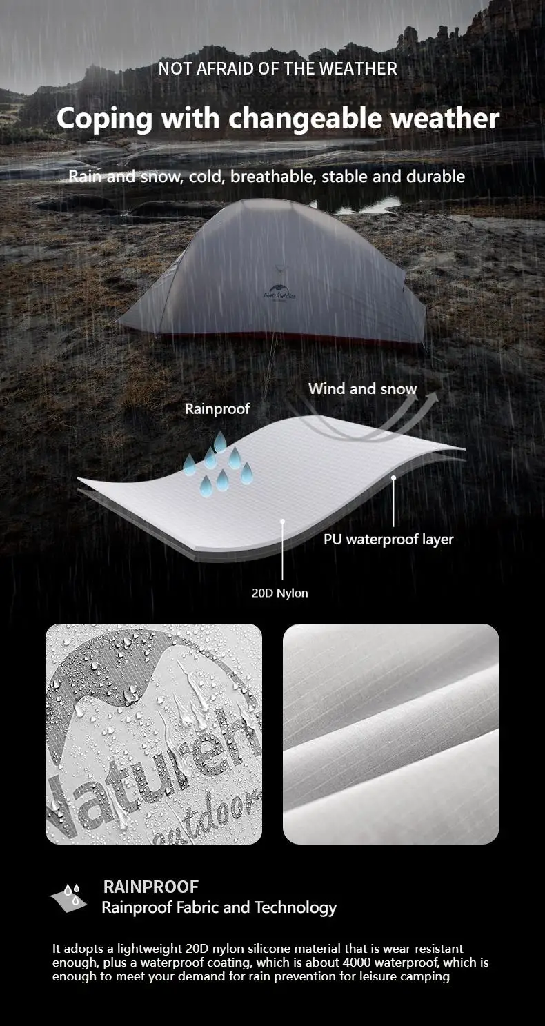 • PU4000mm – For tents made with 20D nylon, ideal for alpine bivouac, heavy rain, and snow-covered ground.